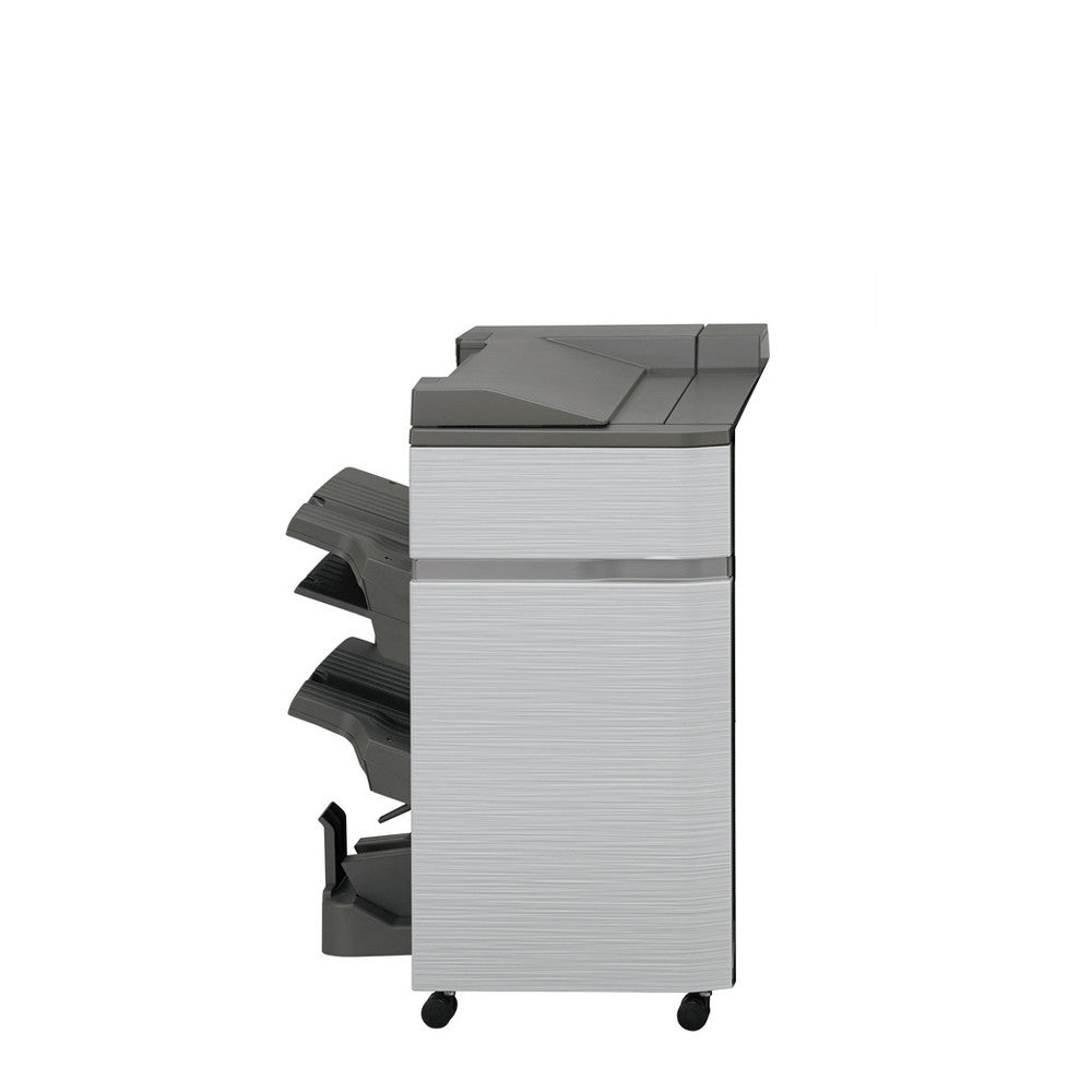 The Sharp MX-FN20 Stapling Saddle Stitch Finisher is an optional accessory for select Sharp copiers. This includes the offset function that outputs sorted sheets of paper while staggering each set of paper, the staple sort function that staples each set of prints, the saddle stitch function that staples the center of the sheets and folds the sheets in half, and the paper folding function that folds paper in half.