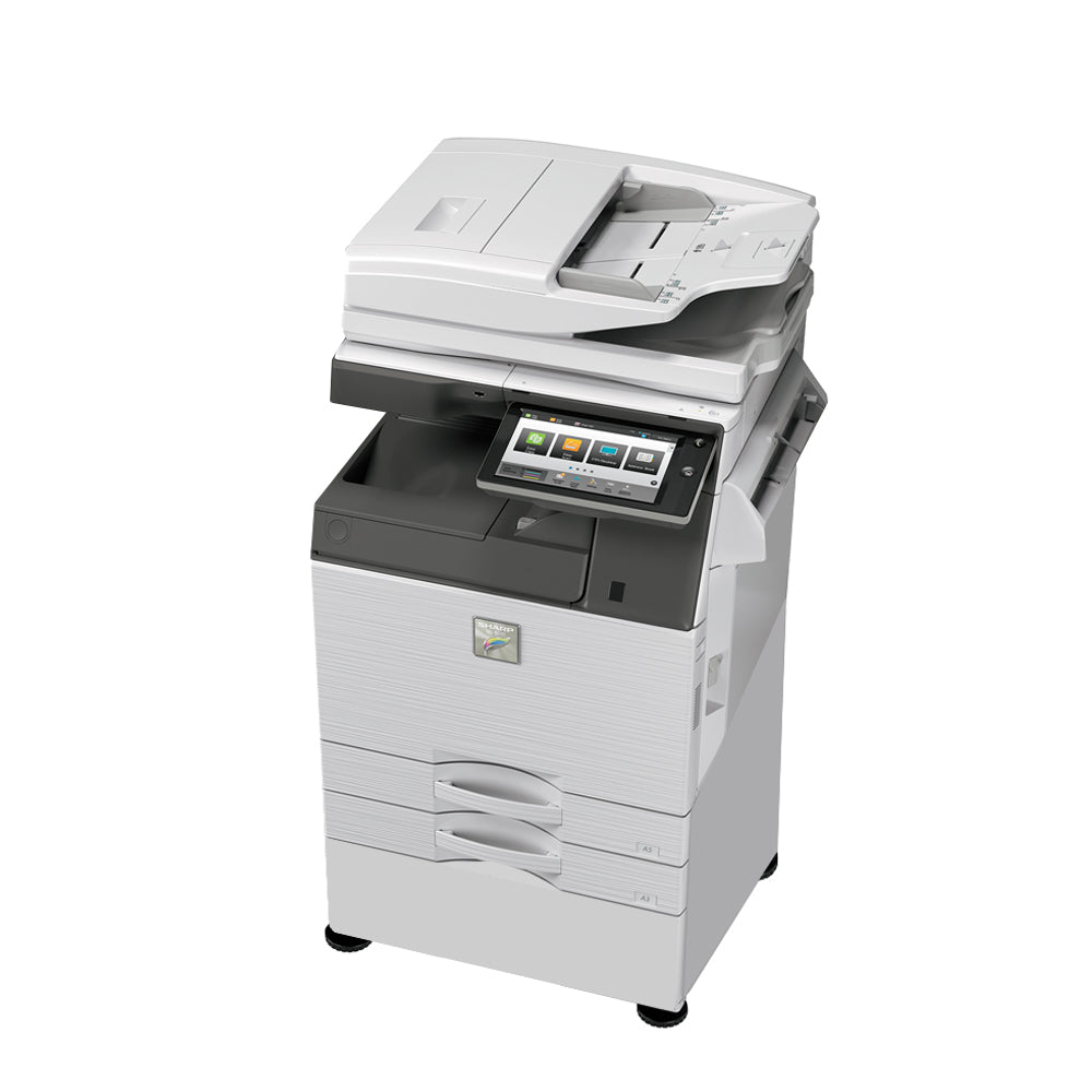 | Feeding options | MX-60ABD Deluxe Copier Cabinet Base (with front door) MX-DE25Stand/1 x 550-sheet Paper Drawer MX-DE26 Stand/2 x 550-sheet Paper Drawers MX-DE27 Stand/3 x 550-sheet Paper Drawers MX-DE28 Stand/1 x 550 + 2,100-sheet Split Tandem Paper Drawers MX-DE29 Low Stand/1 x 550-sheet Paper Drawer MX-LC17 3,000-sheet Large Capacity Cassette (letter, requires MX-DE25/26/27/28) MX-LT10 Long Paper Feeding Tray |