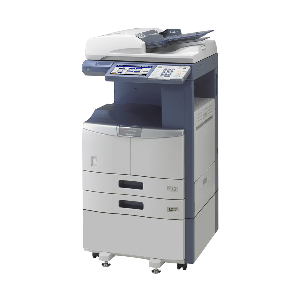 The Toshiba e-Studio 355 prints up to 35 pages per minute, and has a printing resolution of up to 2400 x 600 dpi (with Smoothing). It can print on media sizes up to 11" x 17" inches or A3 paper sizes. It also come with a standard paper input capacity of 1,200 sheets, which can be expanded up to 3,200 sheets.
