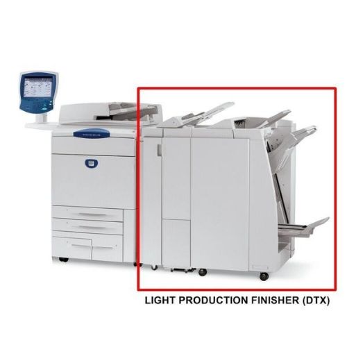 The Xerox DTX Production Finisher with Booklet Maker has the capabilities of the Professional Finisher plus incorporates an interposer input tray that can accept up to 200 sheets and increases the stapling capacity to 100 sheets of 80 gsm paper.